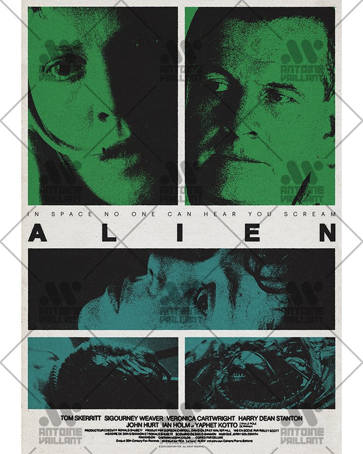 For this Alien poster, the aim is to present the different aspects of the film through an arrangement of rectangular shapes containing elements illustrating the film.