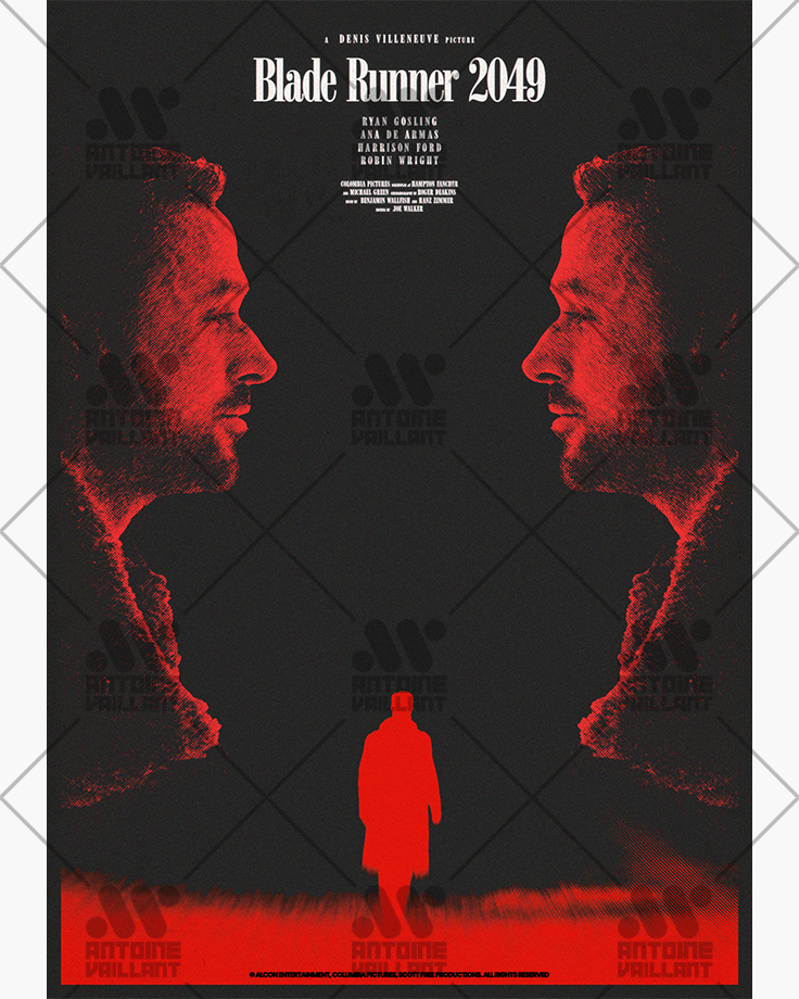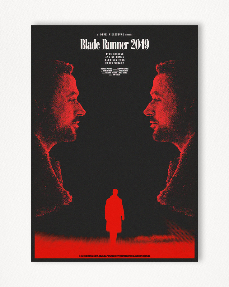 For the approach of this poster Blade Runner 2049, the objective is similar to the poster for First Man and Shaun of the Dead, it is a series of three posters having as a source of inspiration a poster of Goodfellas by Martin Scorsese.