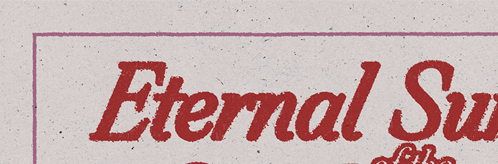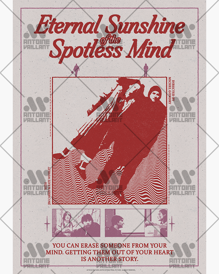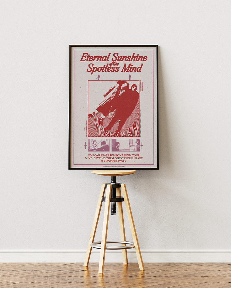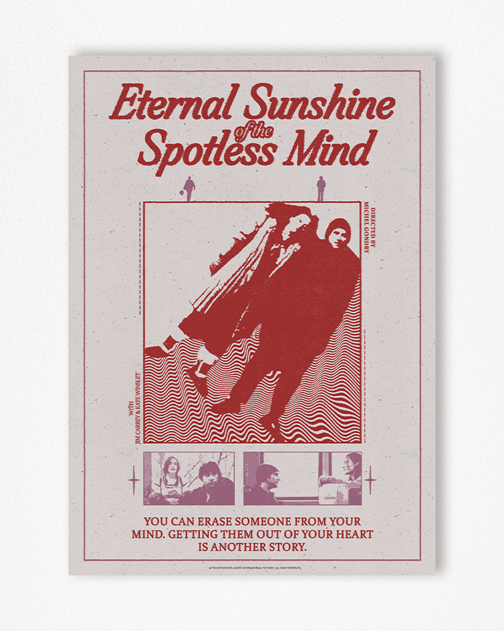 For this poster Eternal Sunshine of the Spotless Mind, the goal is to convey the overall intention and subject of the film, all through an obvious simplicity and a retro, almost melancholic style. The overall layout is based on a succession of elements, refocusing the central subject of the poster through scale contrasts with the title, the scenes and the information at the bottom. The title, voluminous and textured, provides its intrinsic information — the film’s name — and through its texture, adds a print-like style. Its italic orientation matches the movement of the subject just below. The two small pink figures symbolize the characters’ separation and provide a secondary focus, giving an organic hierarchical rhythm to the composition. The subject, the characters side by side, facing right, symbolizes the film’s offbeat tone while maintaining a visual focus.