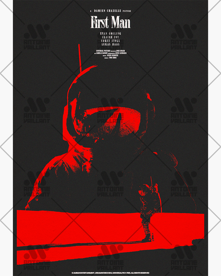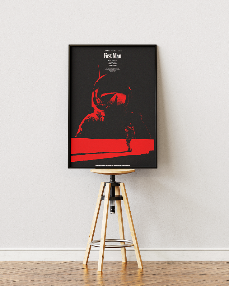 The colors of the poster First Man original visual and the first alternative version were chosen for their simplicity of use and to align with the initial inspiration. Red and white have no specific symbolism except to contrast with the black background.